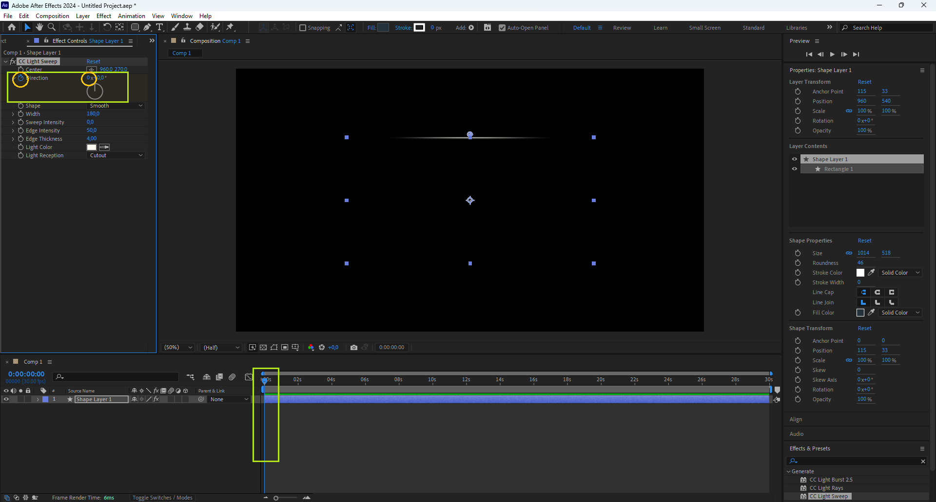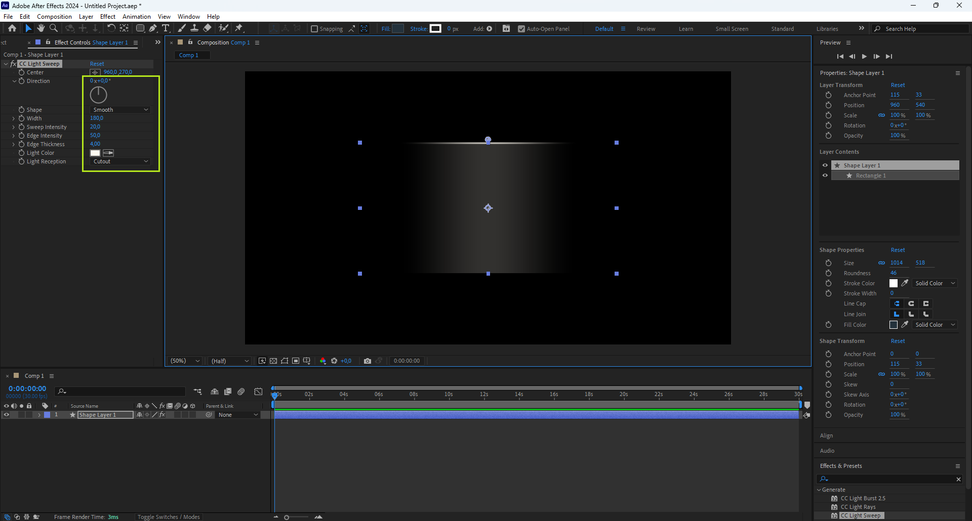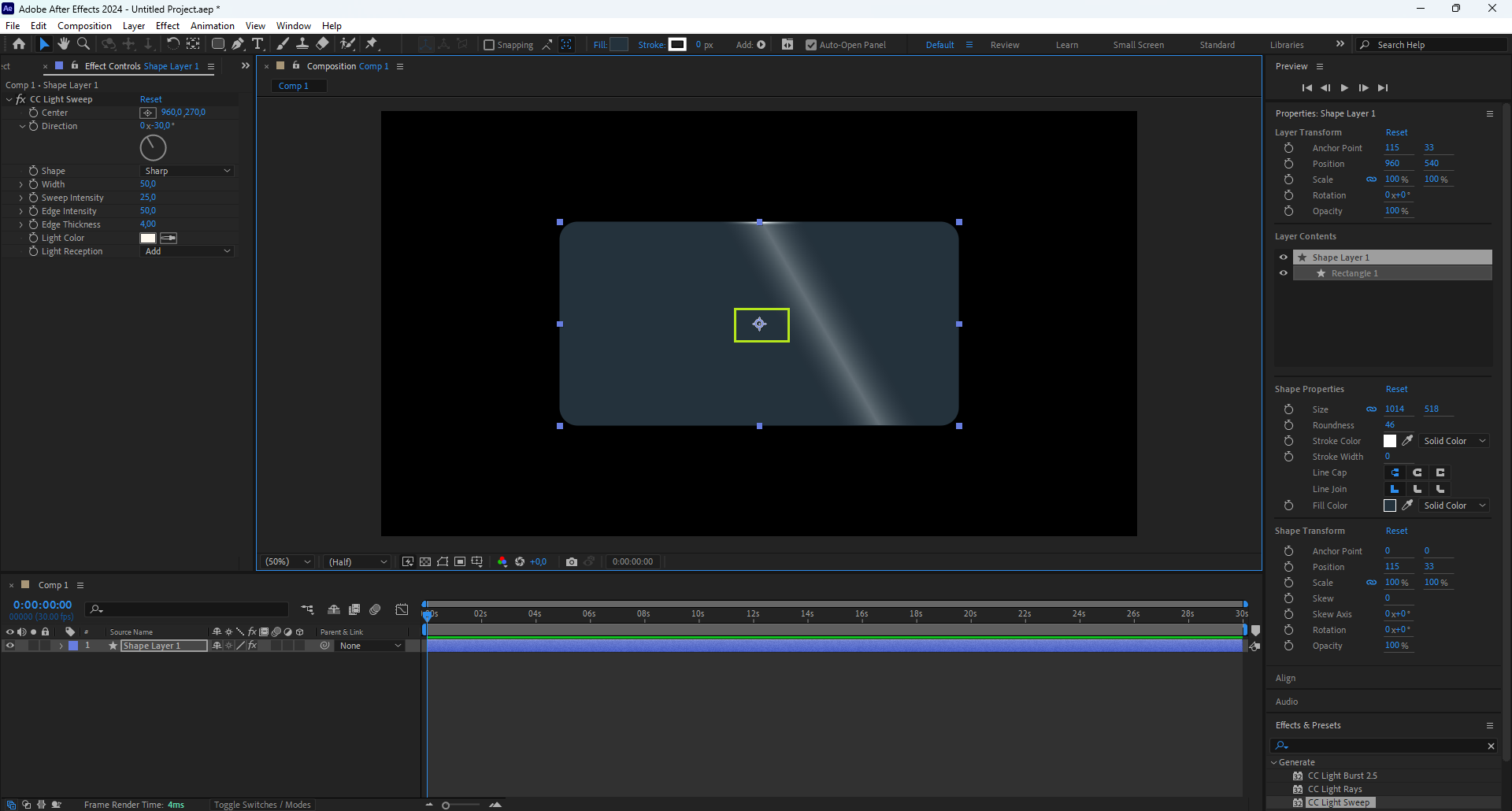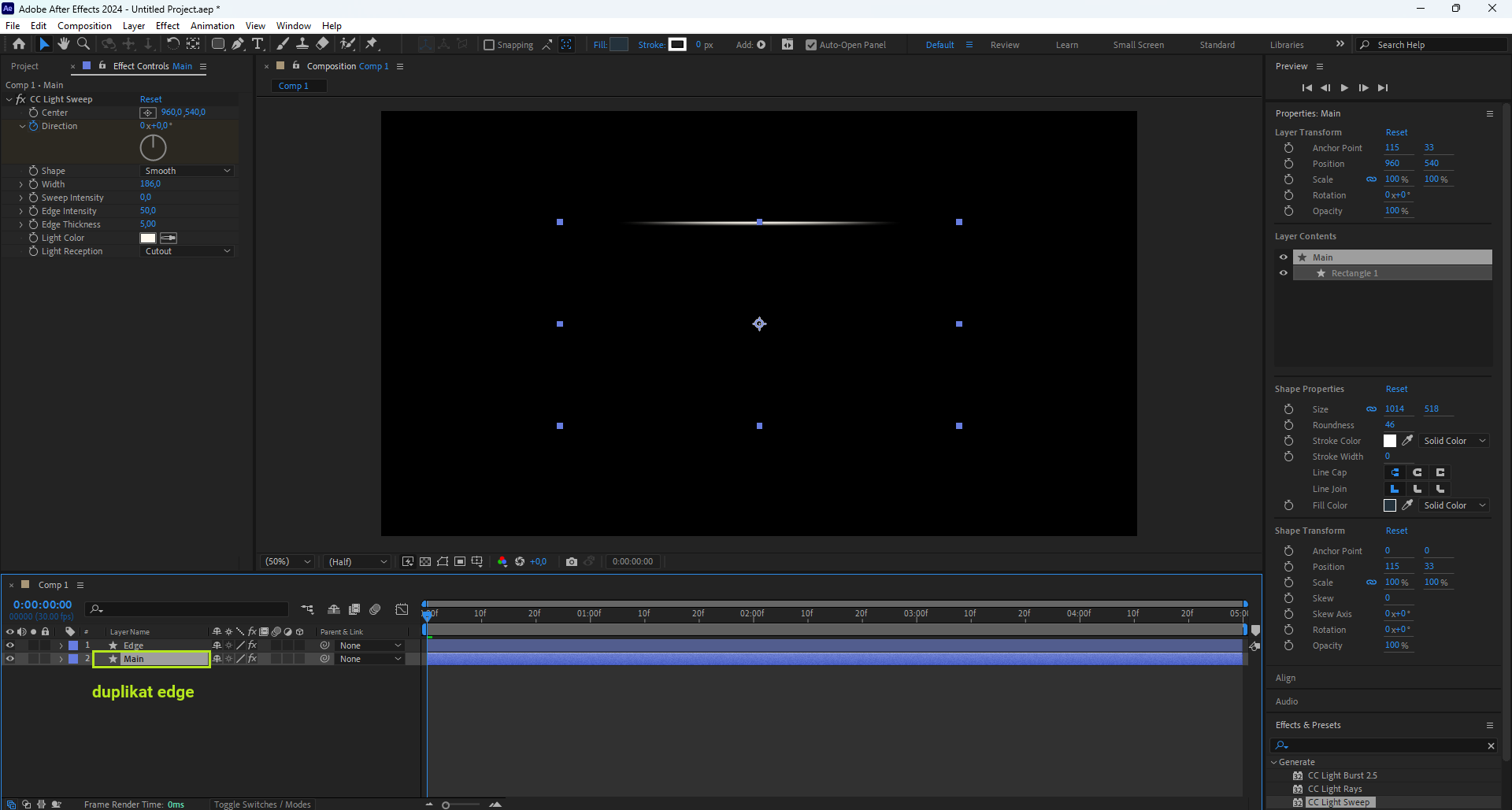 - Menempatkannya di tengah membuat efek seperti CC Light Sweep atau rotation terlihat simetris dan natural.