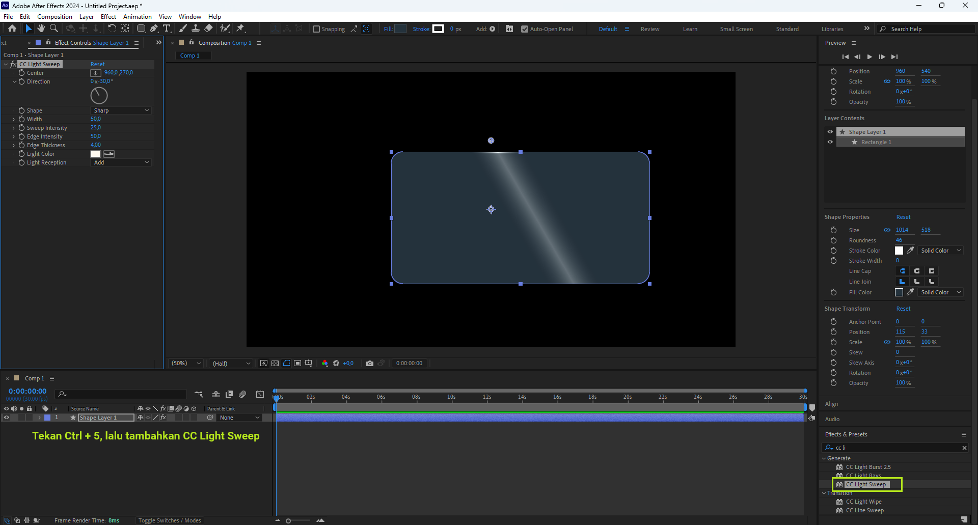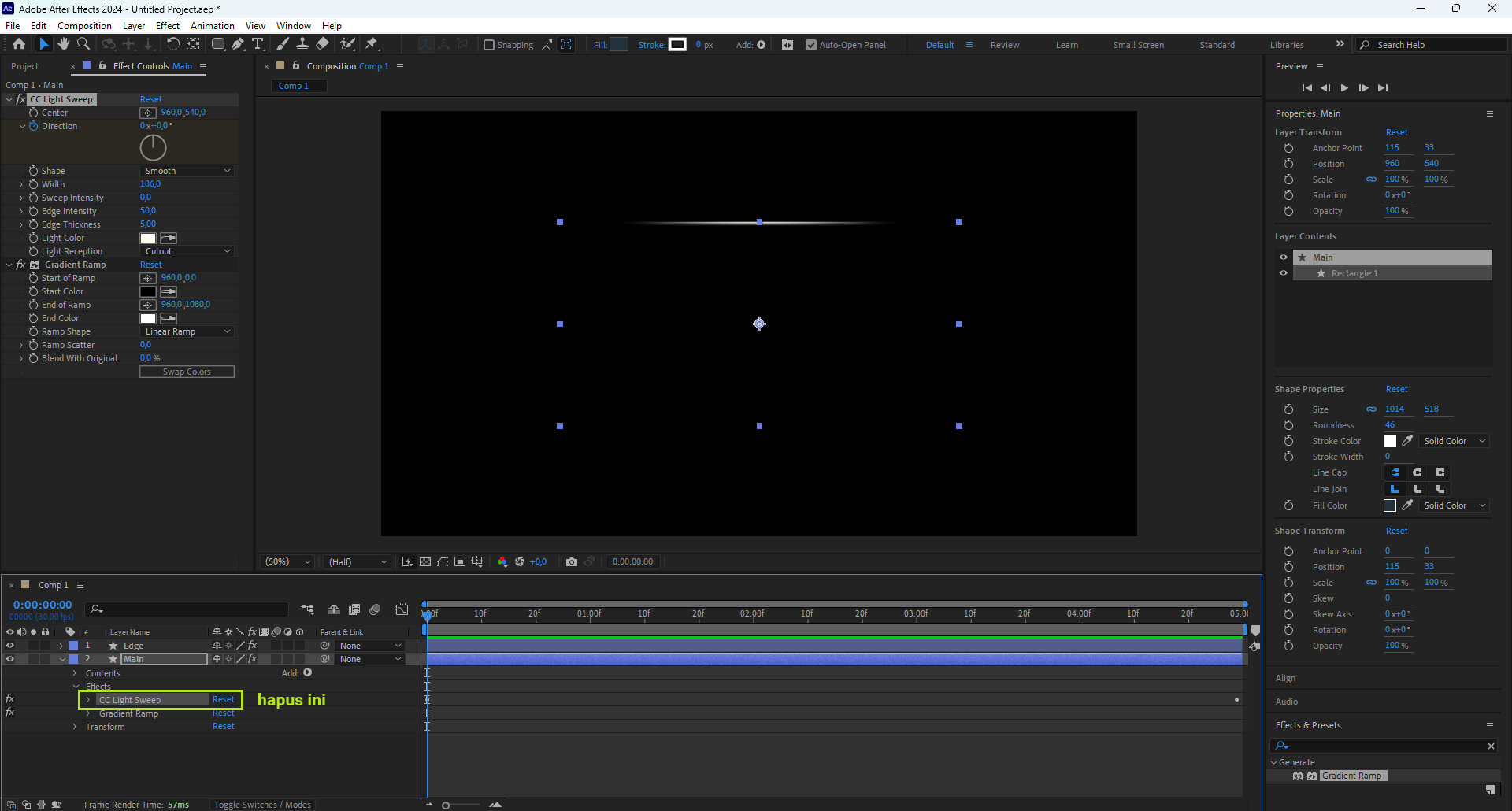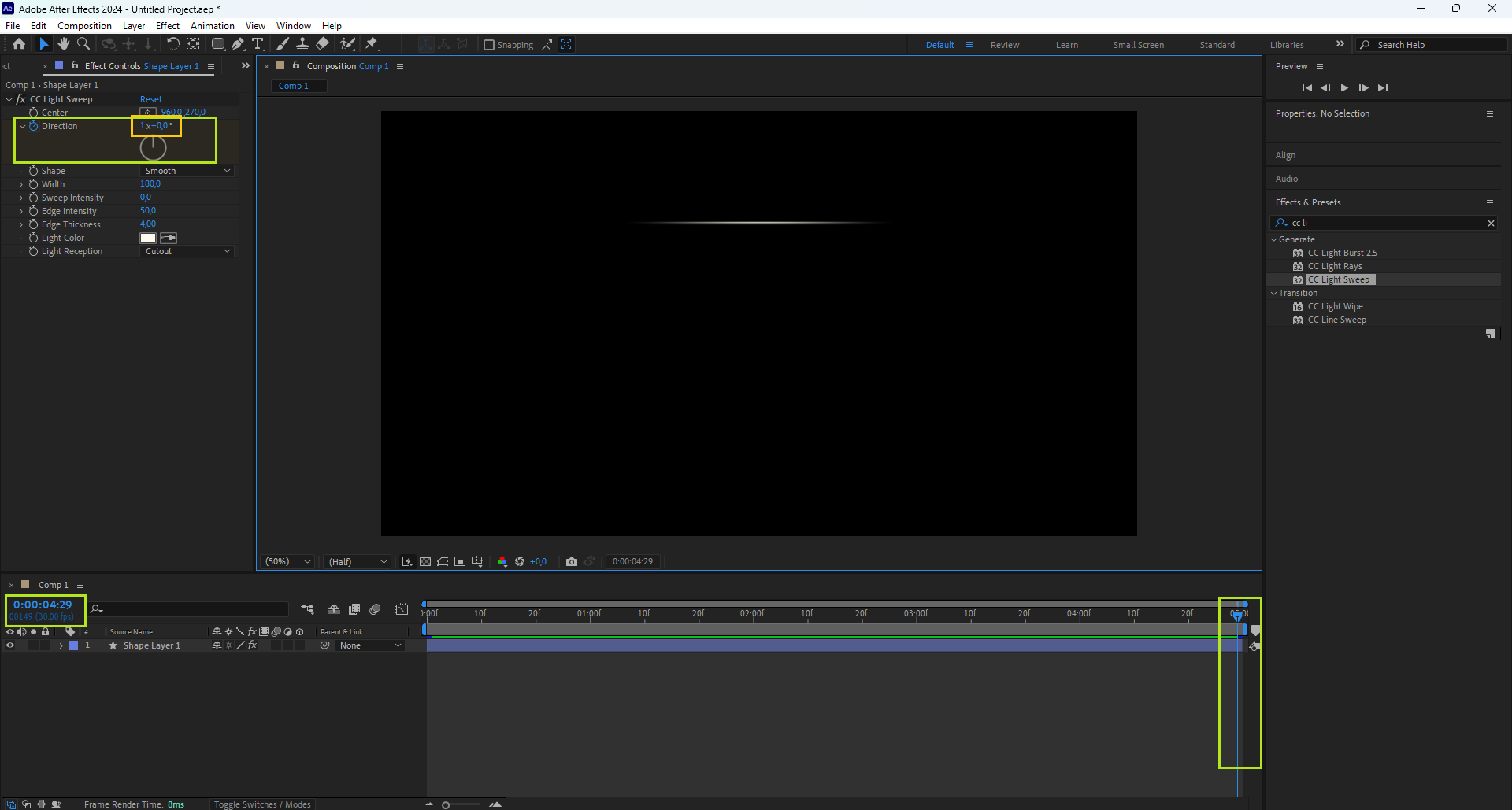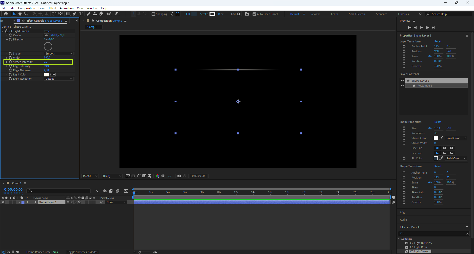 - Menempatkannya di tengah membuat efek seperti CC Light Sweep atau rotation terlihat simetris dan natural.