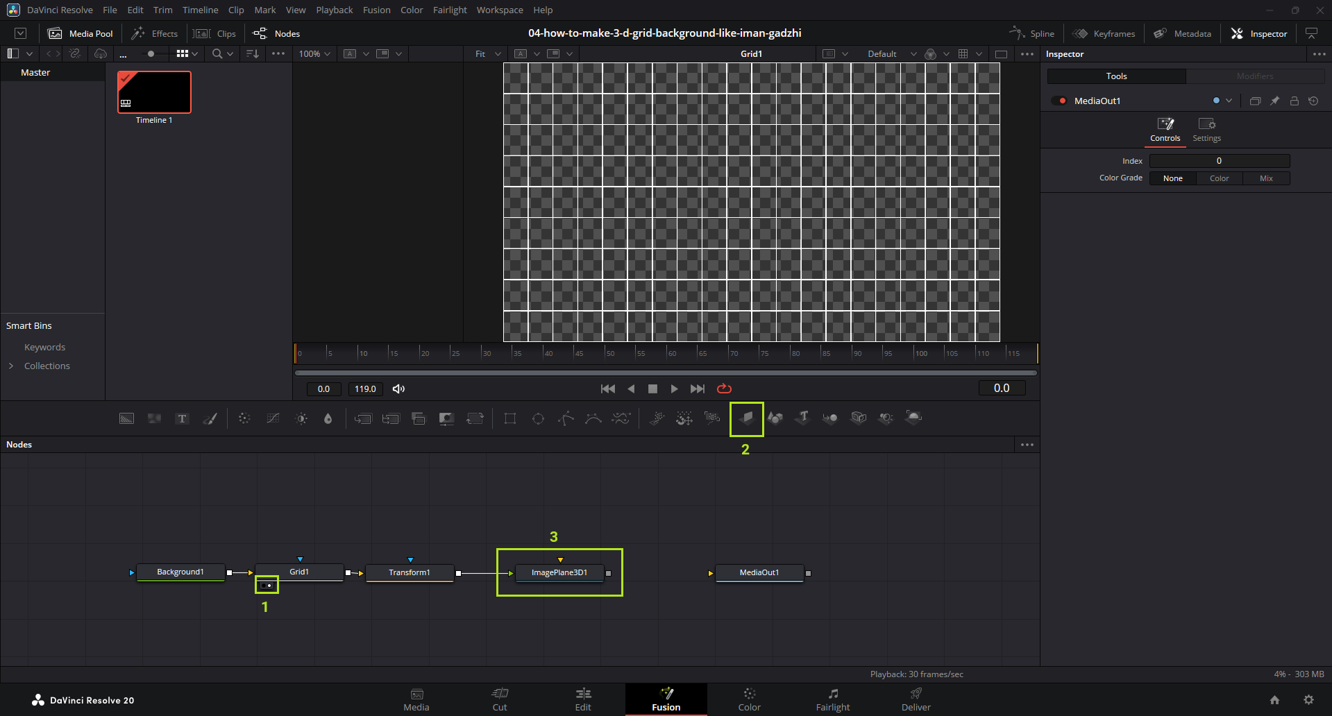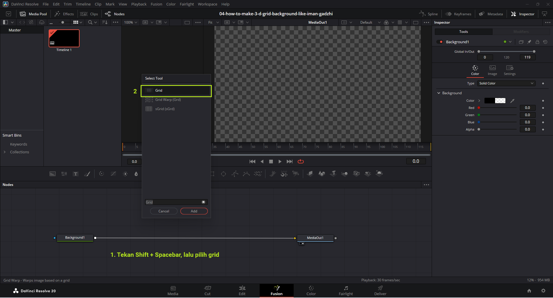 Hubungkan Background1 ke Grid1 lalu ke MediaOut1